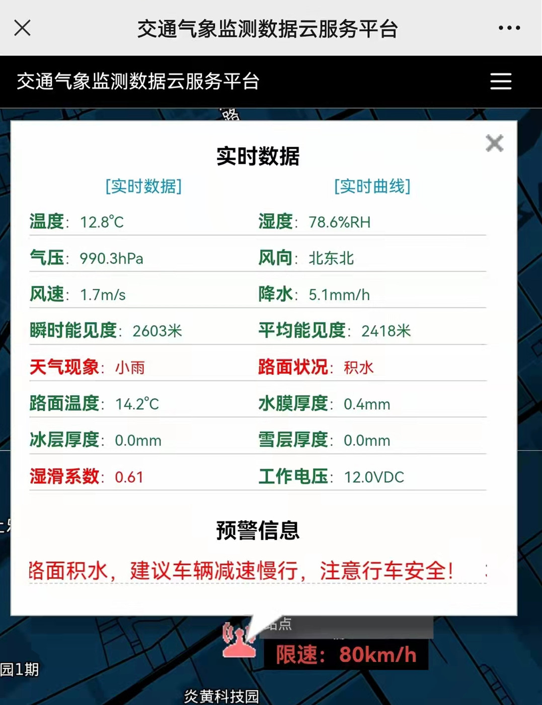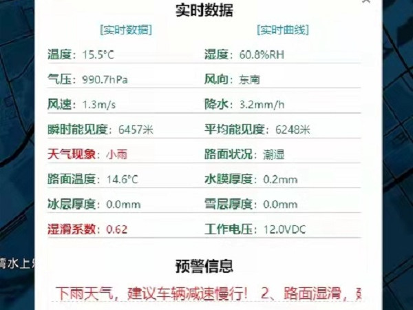 雨天情況下,其天氣現(xiàn)象,濕滑系數(shù)、路面狀況均會顯示紅色字體,及相關(guān)數(shù)據(jù)信息,并且有預警信息,提醒:下雨天氣,路面濕滑,建議車輛減速慢性,注意行車安全,并且有限速提醒。
