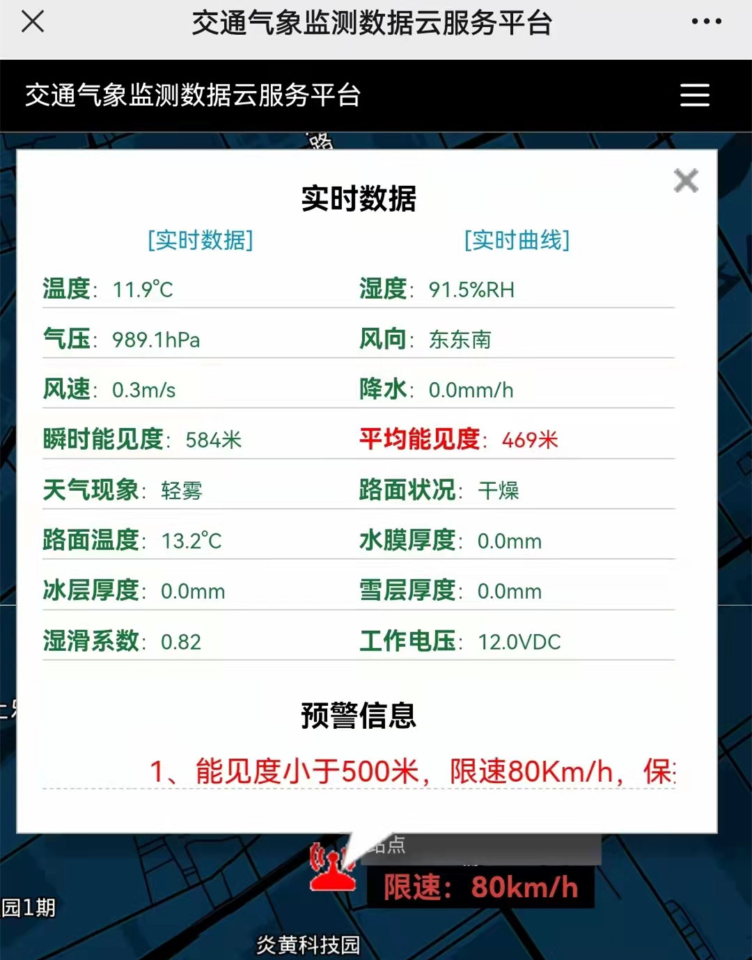 霧天情況下,在實時數(shù)據(jù)中對于平均能見度會顯示紅色字體,其能見度距離也有具體展現(xiàn),并提示預警信息:能見度小于多少米,限速多少,保持車距等相關(guān)提醒。