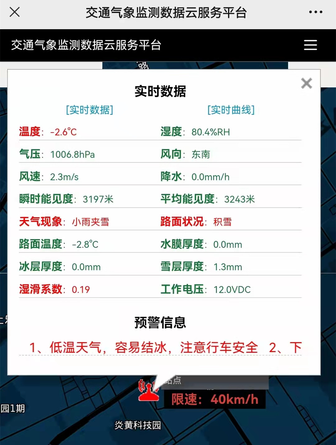 下雪天,在實時數(shù)據(jù)中的溫度、天氣現(xiàn)象、濕滑系數(shù)、路面狀況等數(shù)據(jù)都會顯示為紅色,并預警提醒:低溫天氣,容易結(jié)冰,限速多少等信息。