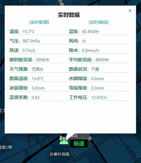 在監(jiān)測平臺中,實時數(shù)據(jù)主要展現(xiàn)數(shù)據(jù)有:溫度、氣壓、風速、瞬時能見度、天氣現(xiàn)象、路面溫度、冰層厚度、濕滑系數(shù)、濕度、風向、降水、平均能見度、路面狀況、水膜厚度、雪層厚度、工作電壓等,不同的氣象要素可根據(jù)需求進行定制。